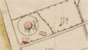 Vergroot weergegeven is hieronder te zien dat de molen is aangeduid met een X, symbool voor de wieken van de molen. Duidelijk is te zien dat de molen op een rond perceel stond met kadastraal nummer 558, een “enclave” in het perceel kadastraal nummer 557.