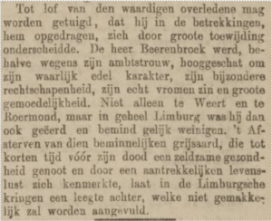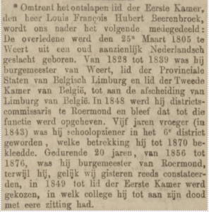 Van 1847 tot 1850 was Louis Berenbroek districtscommissaris van Roermond en van 1856 tot zijn overlijden in 1875 burgemeester van Roermond. Na zijn overlijden verschenen er in diverse kranten uitgebreide necrologieën. Een daarvan is hierna opgenomen.