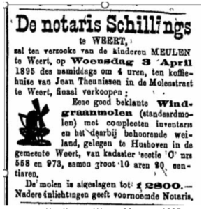 Al op 19 januari 1895 verscheen er in Het Kanton Weert een advertentie waarin werd aangekondigd dat notaris Schillings op verzoek van de kinderen Meulen op maandag 4 februari 1895 ten koffiehuize van Martinus van de Kerkhof in de Molenstraat te Weert publiek zou verkopen:
