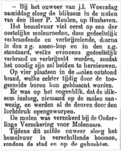 Op 10 juni 1903 sloeg tijdens een hevig onweer de bliksem in de molen van Piet Meulen. Onderdelen van de molen werden zwaar beschadigd. Ook ontstond er brand die echter snel door de buren geblust kon worden. Op het moment van de inslag was er niemand in de molen aanwezig. De molen was verzekerd bij de Onderlinge Verzekering voor Molenaars.xxxix