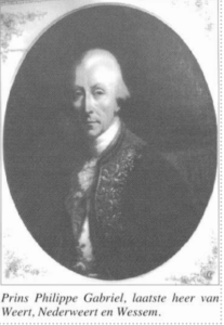 [4] Philippe Maurice Joseph d’Alsace d’ Henin Liétard, prins van Chimay, is geboren op 12 september 1736 te Brussel en overleden op 24 juli 1804 te Parijs. Hij is begraven in de Chapelle funéraire des Seigneurs de Bousssu, in Boussu, Wallonië. Na de onthoofding van Philips de Montmorency, graaf van Horne, waren de heerlijkheden Weert door het Hof van Gelre vervallen verklaard aan koning Philips II als hertog van Gelre. Deze confiscatie werd op 17 november 1610 opgeheven door de landvoogden Albrecht en Isabella van de Habsburgse Nederlanden. Sabina van Egmond werd deels hersteld in haar rechten als rechtsopvolgster van Philips de Montmorency. De heerlijkheid kwam na een kort intermezzo in handen van de familie d’Alsace d’ Henin Liétard, prinsen van Chimay.