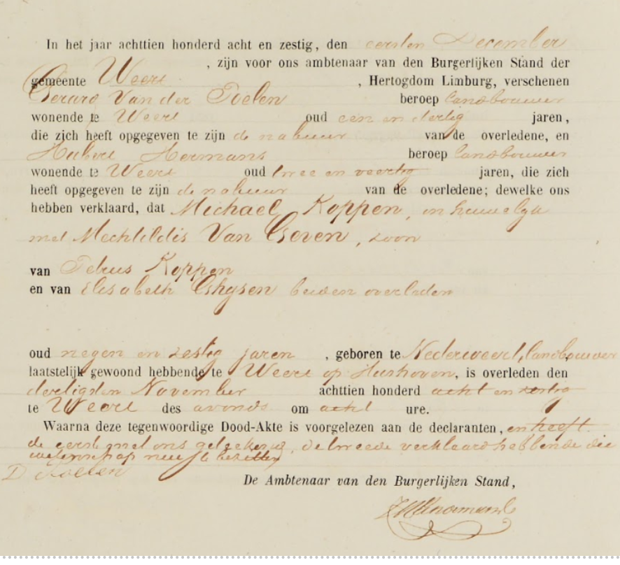 Mechtildis van Geffen is overleden op Hushoven, Weert, op 2 april 1869. Michael Koppen is overleden op Hushoven, Weert, op 30 november 1868.