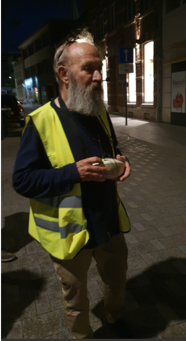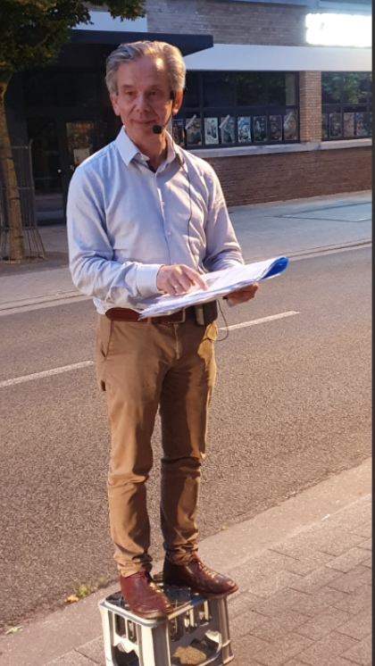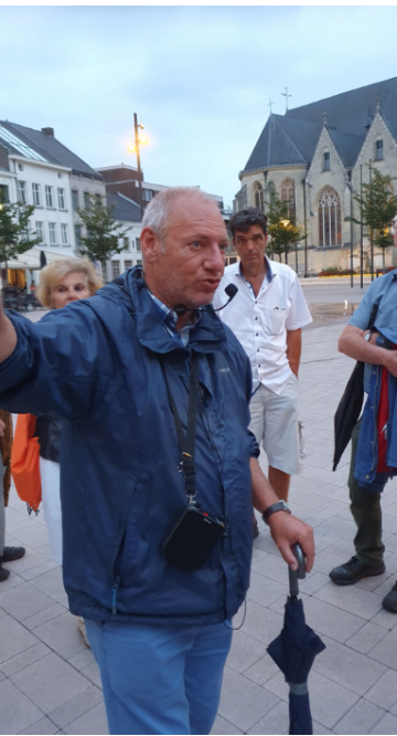 Het was inmiddels een beetje gaan regenen en ook de duisternis viel in. De laatste plek van de rondleiding van de avond was de hoek Hoogstraat-Opitterstraat. Bert Stoffels vertelde ons daar dat de Opitterstraat vroeger de belangrijkste straat van Bree was. De postkoets naar `s Hertogenbosch had daar zijn eindpunt. Later liep de tramlijn er doorheen. In de top van het hoekpand staat een beeldje van Sinterklaas, volgens Bert met een blauwe mijter. Vanwege de duisternis heeft uw verslaglegger dat niet kunnen controleren. Dat beeldje staat er overigens niet zonder reden. Op deze plek was voorheen de Sint Nicolaaskapel gevestigd. In de Opitterstraat was ook de eerste stadsschool van Bree gevestigd.