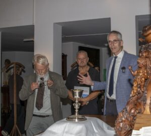 De ontvangst vond plaats in de prachtige binnenhof van kasteel Nijenborgh in Weert en werd ook bijgewoond door vertegenwoordigers van erfgoedorganisaties uit Nederweert en Weert. Ook het bestuur van De Aldenborgh was vertegenwoordigd. Deken Jack Honings van de St. Martinuskerk leidde het gezelschap rond in ‘zijn’ kerk. In een Dan Brown-achtige sfeer werd daar de beroemde zilveren ‘Spaanse kelk’ uit 1601 getoond. Ooit een geschenk van de Spaanse soldaten omdat ze vanwege de strubbelingen in o.a. Nederweert heel wat goed te maken hadden.