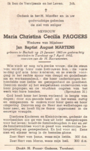 Maria Christina Cecilia Paggers is geboren op 25 januari 1866 te Bocholt en overleden op 7 april 1952 te Turnhout. Zij is op 4 april 1893 voor de kerk getrouwd met Joannes Baptist Augustus Martens, geboren 12 november 1866 te Geel en overleden op 1 augustus 1947 te Turnhout.iv