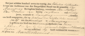 Deel geboorteaangifte Bartholomeus van Deuren.