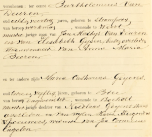 Deel huwelijksakte Bartholomeus van Deuren en Maria Catharina Goyens.