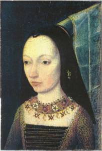 Portret van Margaretha van York, derde echtgenote van Karel de Stoute, met in de band rond haar hals de rode roos van Lancaster en de witte roos van York.