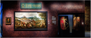 Foto van een deel van de tentoonstelling met o.m. banier met lijfspreuk van Karel de Stoute (Berliner Historischer Museum) en schilderij ‘Beleg van Neus” (hof van Busleyden, Mechelen). Foto: Levin den Boer voor het Limburgs Museum.