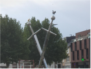 De twee zwaarden zijn een verwijzing naar de tijd dat mensen elkaar met zwaarden bevochten bij de Brustempoort. De plaats waar de zwaarden elkaar raken is een symbool voor een kus van verzoening. De haan en in het bijzonder de kip zijn dieren waar Vanmechelen verzot op is. Afbeeldingen van kippen zijn vaak terug te vinden in zijn kunstwerken. Hij kruist ook kippen om een sterker ras te creëren.