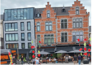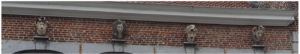 Na de lunch in een van de vele horecagelegenheden die Sint-Truiden rijk is, was het tijd voor een rondwandeling in het centrum van Sint-Truiden. Op de Groenmarkt attendeerde onze gids ons op een rijtje panden. Twee daarvan dateren uit het begin van de 20ste eeuw en zijn in klassieke stijl gebouwd. Het andere is een modern gebouw met een glazen serre als opbouw. De gevel daarvan is bezet met blauwwitte tegeltjes met afbeeldingen van verschillende kippenrassen, een project van kunstenaar Koen Vanmechelen.