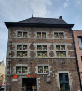 Op de hoek van de Luikerstraat en het Heilig Hartplein staat een van de oudste huizen van Sint-Truiden, daterend uit 1653. Door de marktkramen begaven we ons naar het stadhuis. Dat staat vrijstaand ongeveer in het midden van de markt. Die plaats was de uitkomst van een dispuut tussen de abt van de abdij van Sint-Truiden en de bisschop van Luik. De kern van het stadhuis is de oorspronkelijke lakenhal. Daaromheen is later het stadhuis gebouwd.