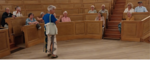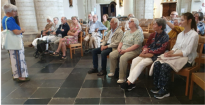Deelnemers aan de rondleiding in de kerk, aandachtig luisterend naar Kathleen Smolders.