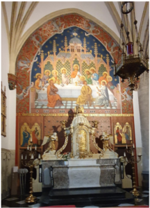 Onder de moderne, naar de gelovigen gerichte altaartafel bevindt zich achter glas de reliekschrijn van de heilige Trudo.
