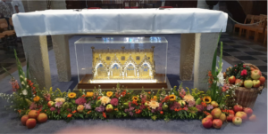 Reliekschrijn Sint Trudo met bloemen en fruit.