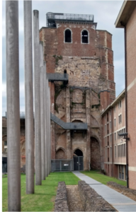 Aan de achterzijde van de toren zijn de verschillende bouwfasen duidelijk te onderscheiden. De metalen palen staan symbool voor de pilaren van een zijbeuk van de vroegere abdijkerk.