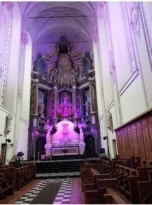 Als laatste onderdeel van onze groep stond een bezoek aan de Minderbroederskerk op het programma. Deze bleek gesloten te zijn, maar onze gids wist op slinkse wijze via de tuin en een zijingang toch toegang tot de kerk te verkrijgen. De Minderbroederskerk was een kerk van de Franciscanen, een bedelorde, naar de kleur van hun pij ook “bruine paters” genoemd. In de tuin had vroeger een pesthuisje gestaan waar de pestlijders verzorgd en gevoed werden. De tuin wordt aan een kant afgesloten door restanten van een oude vestingmuur van de stad Sint-Truiden.